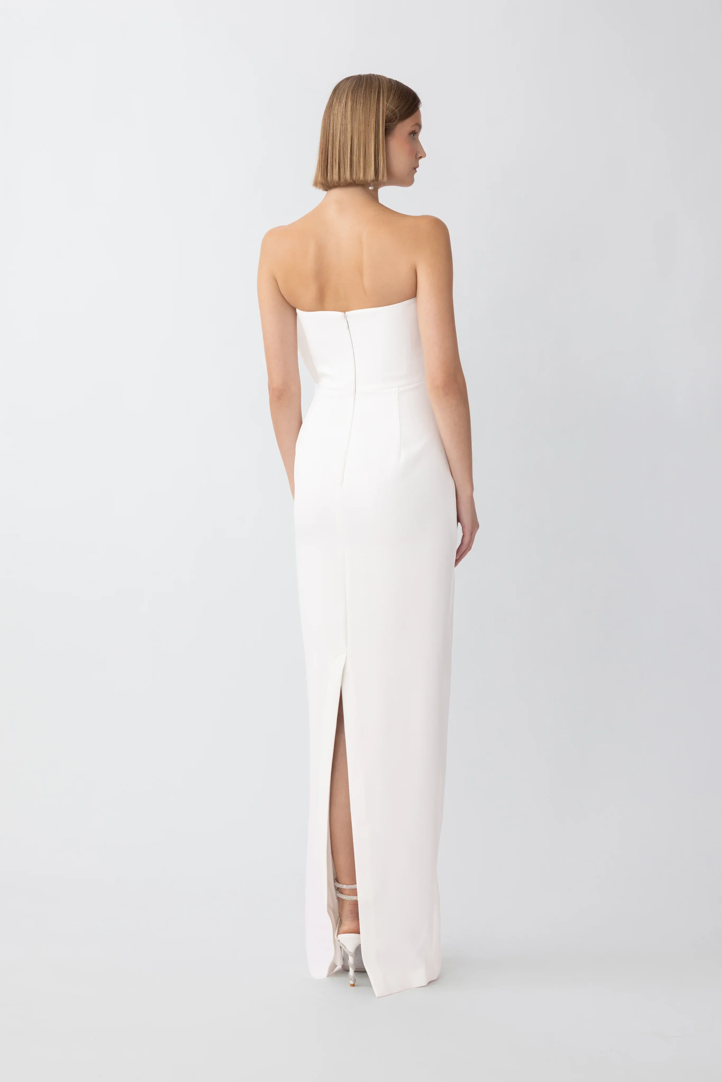 Strapless crepe fitted gown featuring an asymmetrical bow design