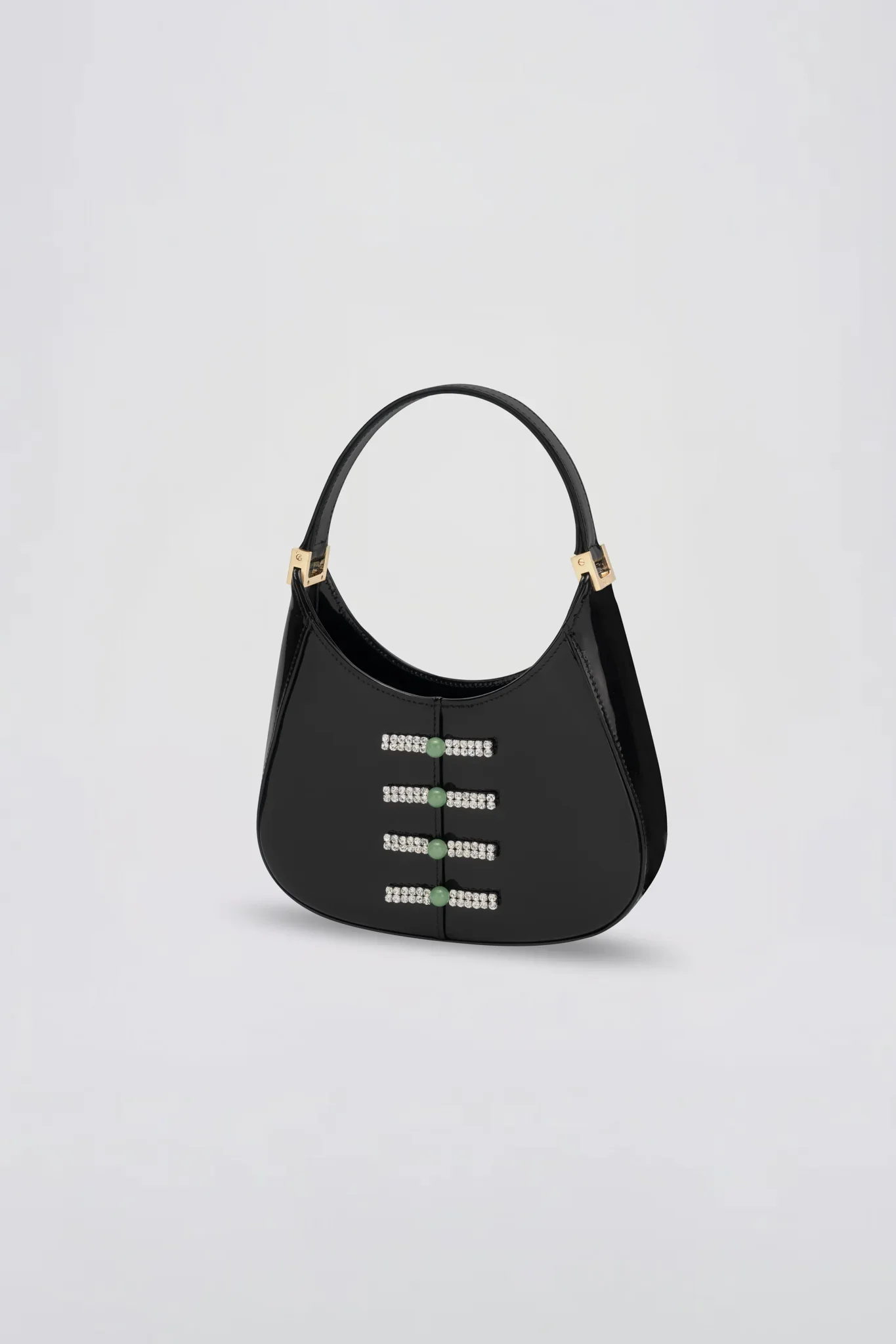 Our updated pipa-shaped mini bag crafted from premium patent leather with classic leather base and handle. The glossy finish is extra-shiny adorned with new button detail featuring translucent crystals and green jadeite. A sophisticated touch to complete your elevated look. The mini sau is the perfect size to carry what you need while looking chic on any occasion.