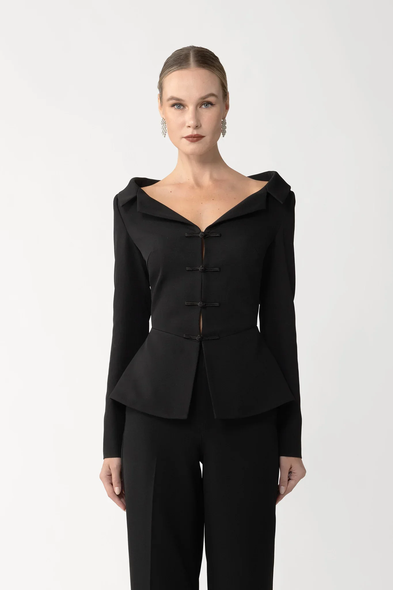 This medium-weight crepe top is tailored off the shoulder for a flattering fit that sculpts the bust and cinches the waist with classic pankou buttons. Pair this with the Niope Pant for a complete look.