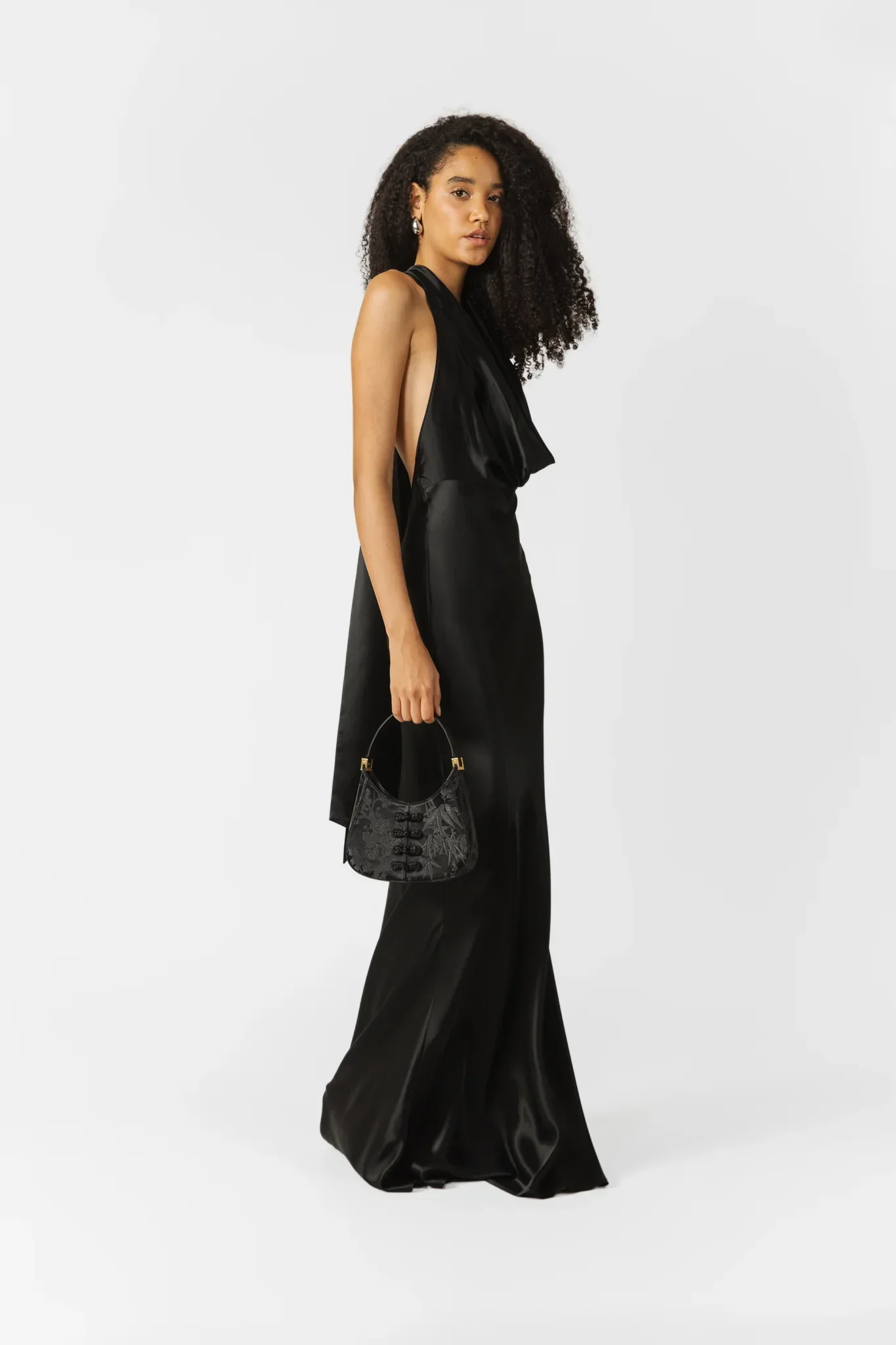 Halter satin gown in bias-cut fit with cowl neckline featuring elongated statement wings that drape from the back of the neck