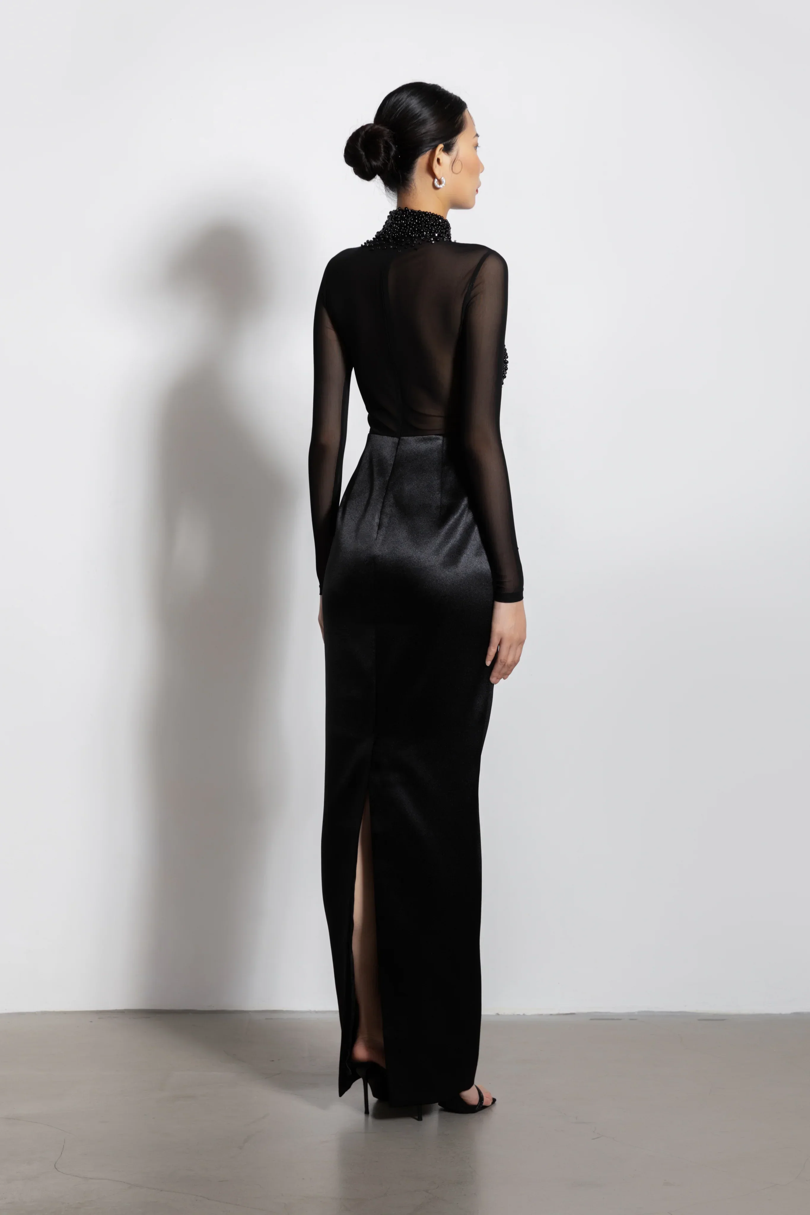 Modern Cheongsam gown with a mesh long-sleeved top and thick satin skirt featuring pearl and crystal beading