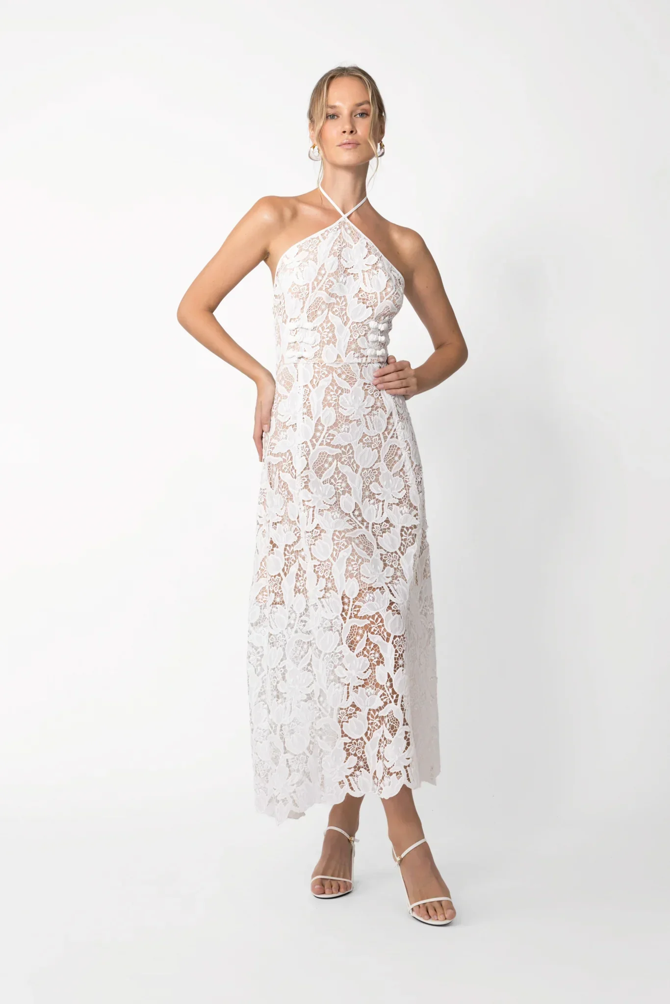 Lace midi halter neck sundress featuring signature pipa knot detail