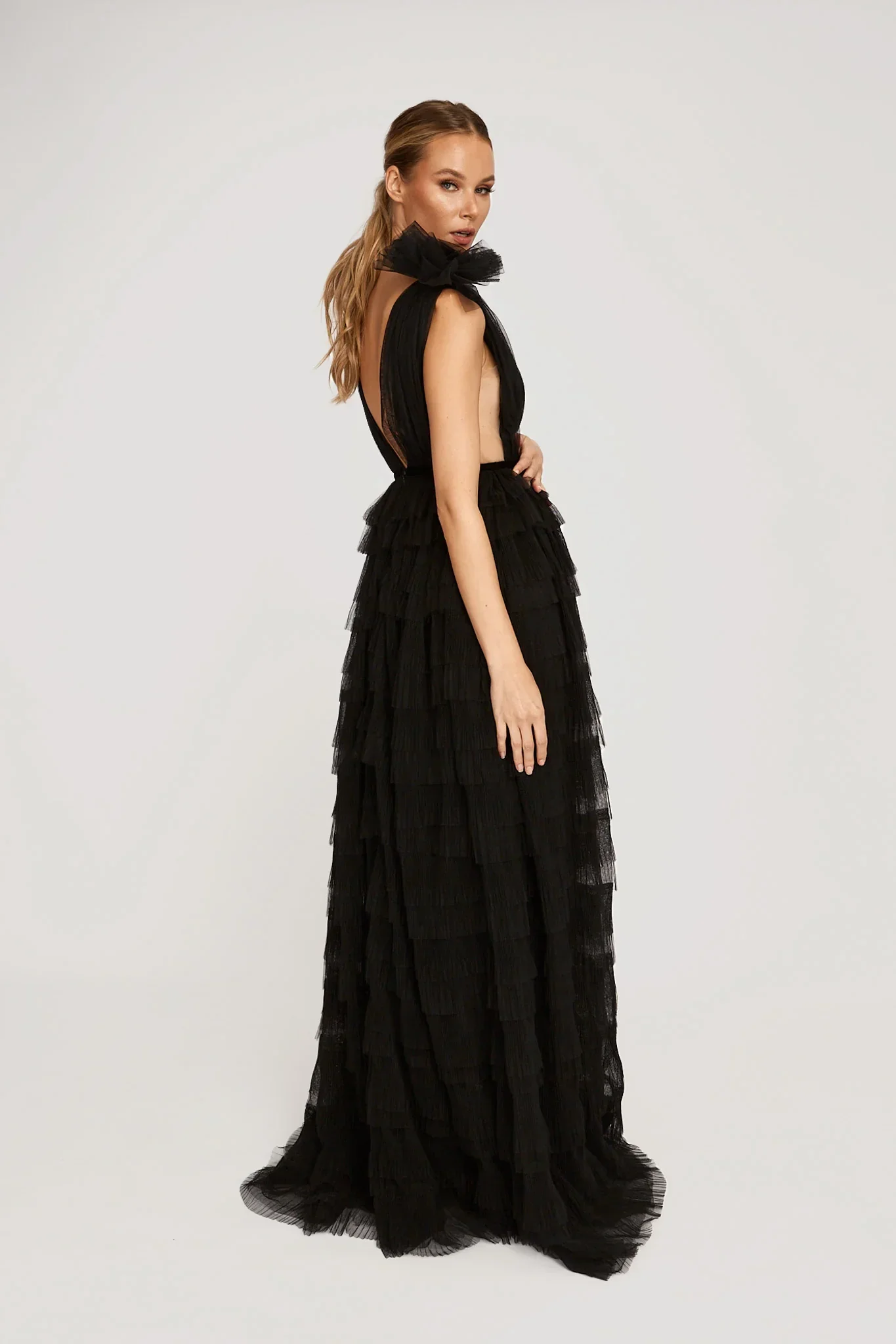 Romantic open-back ruffled gown featuring swathes of flocked tulle cascading to a sweeping hem with plunging neckline