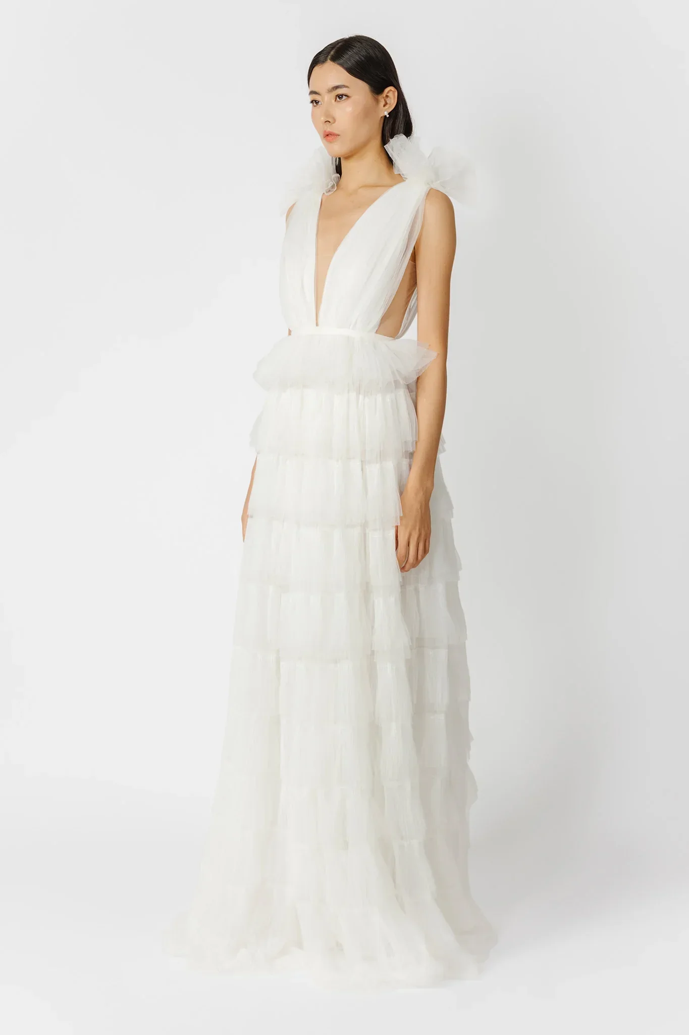 Romantic open-back ruffled gown featuring swathes of flocked tulle cascading to a sweeping hem with plunging neckline